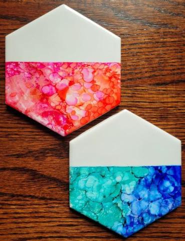 Join Designer Elizabeth to learn about colors and explore the world of vibrant alcohol inks. Demo and techniques will be shared. Let your creativity run as you create your unique art on a coaster. Beginners welcomed, no experience necessary.