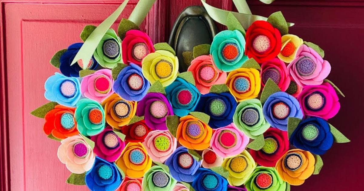 Make a sweet and colorful door hanging with artist Bonnie Schwartz. This is done by rolling felt into beautiful “roses” and using hot glue to attach them to a backing that you can hang on a wall or doorknob. Pretty and easy!
