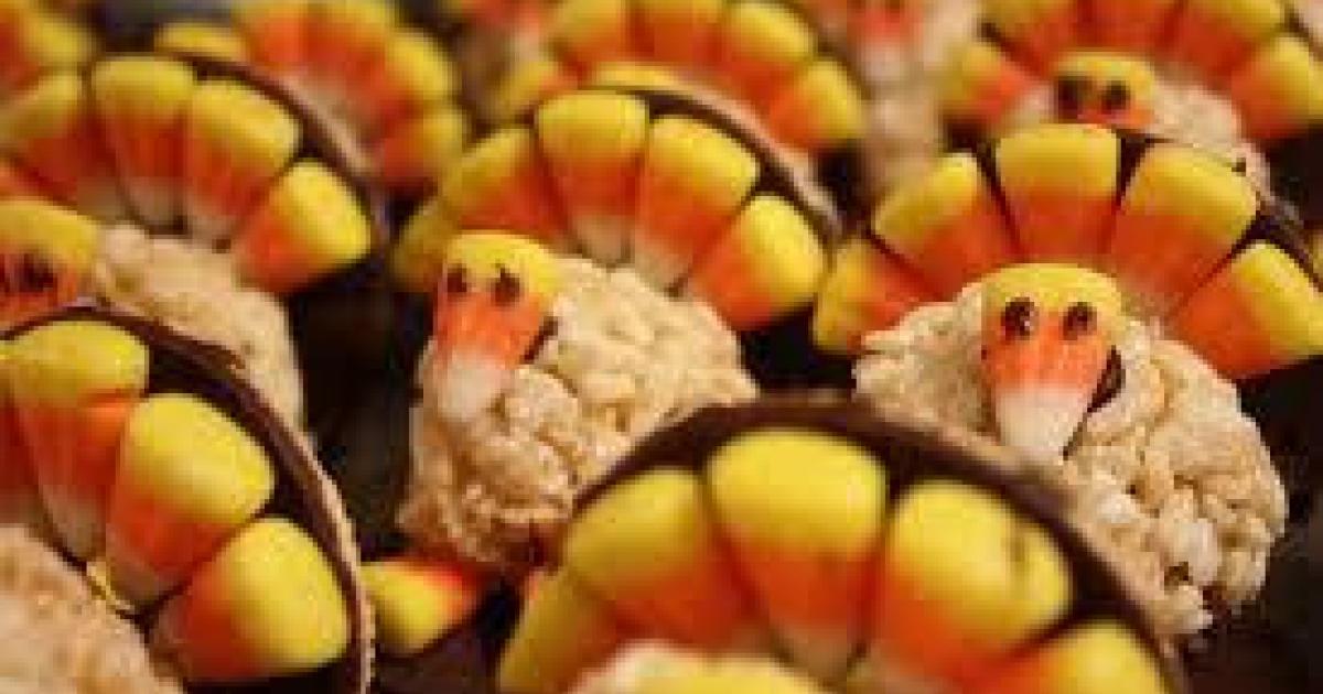Make these tasty turkeys using cookies, rice crispy treats, chocolate, and candy corns. Take home in a decorated bakery box!