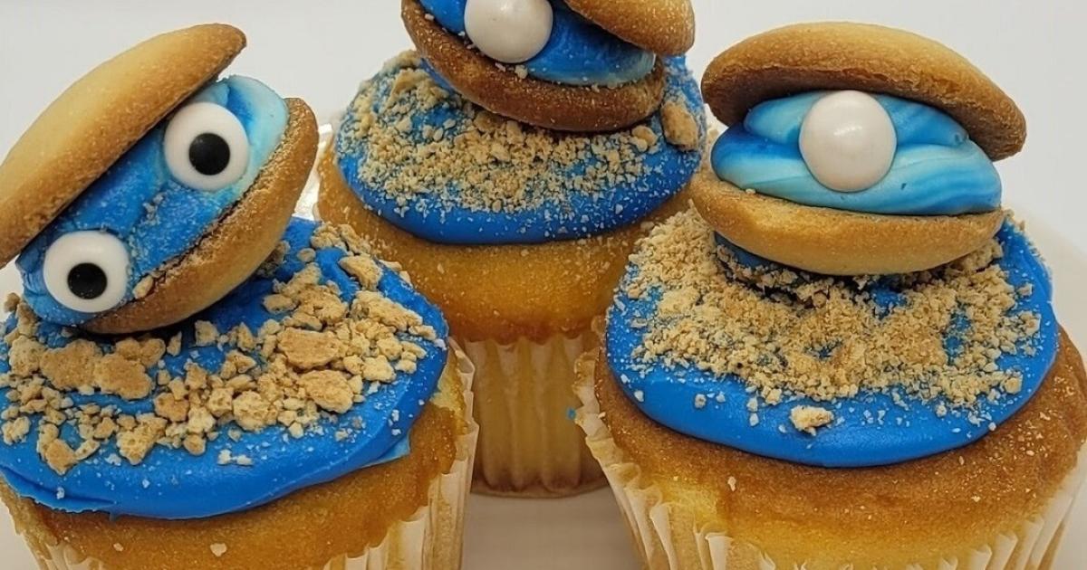 Create these adorable little clams on a cupcake using blue buttercream topped with a chocolate pearl, sugar eyes, and cookies for the clam shell!