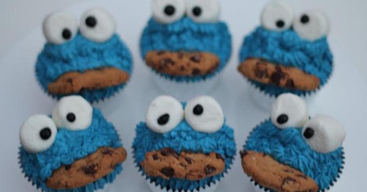 Decorate three cupcakes using blue frosting placed in a pastry bag and fitted with a rosette tip. Make eyes out of marshmallows and then of course the cookie mouth.