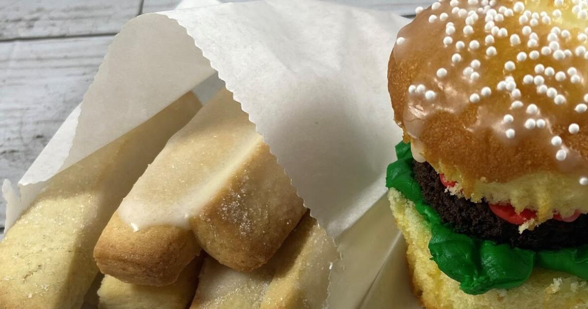 Make two burger cupcakes with a side of cookie French fries using buttercream icing, candy and sprinkles.
