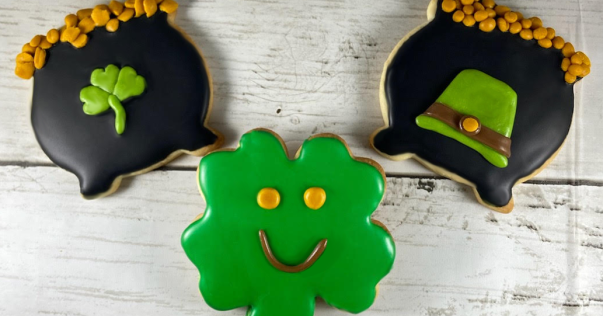 Decorate two pot of gold cookies and one shamrock using sugar glaze, fondant, and candy.