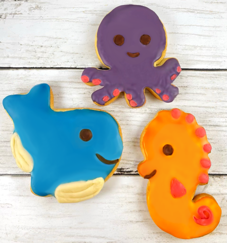 Create a whale, seahorse, and octopus cookie using sugar glaze and assorted candy.