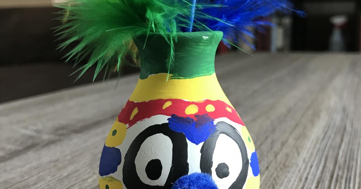 What looks like a boring, old vase can be transformed into a crazy face using paint, jewels, and feathers. Register September 9.