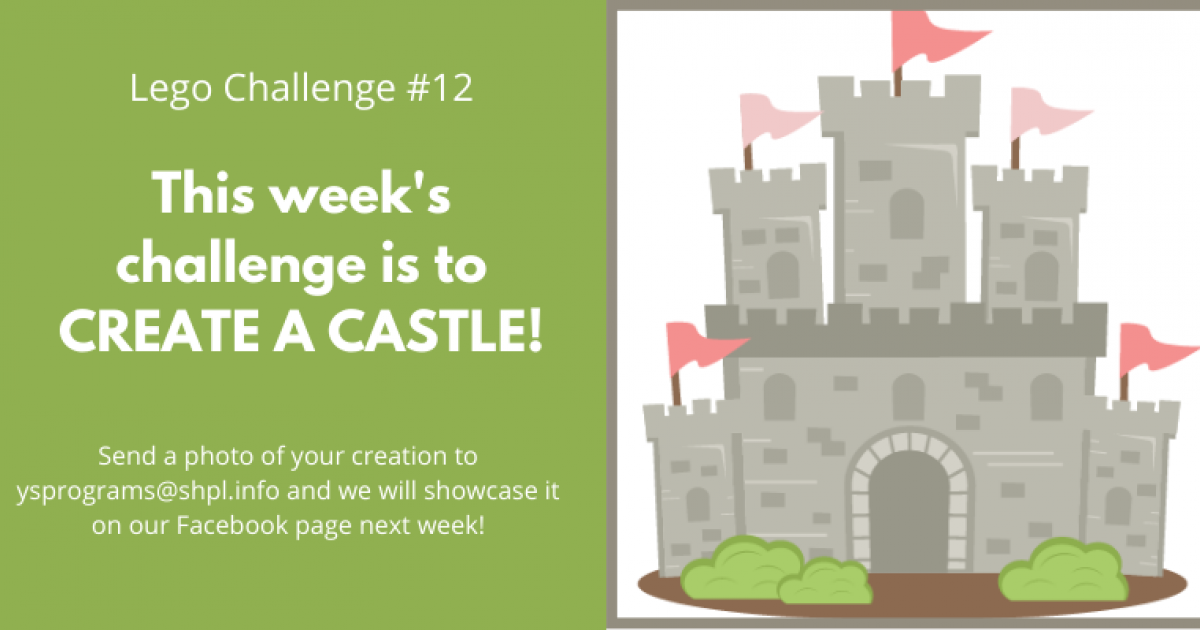 Join us for a new Lego challenge! This week's challenge is to CREATE A CASTLE! Send a photo of your creation to ysprograms@shpl.info and we will showcase it on our Facebook page next week!