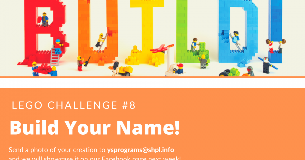 Join us for a new Lego challenge! This week's challenge is to BUILD YOUR NAME! Send a photo of your creation to ysprograms@shpl.info and we will showcase it on our Facebook page next week!