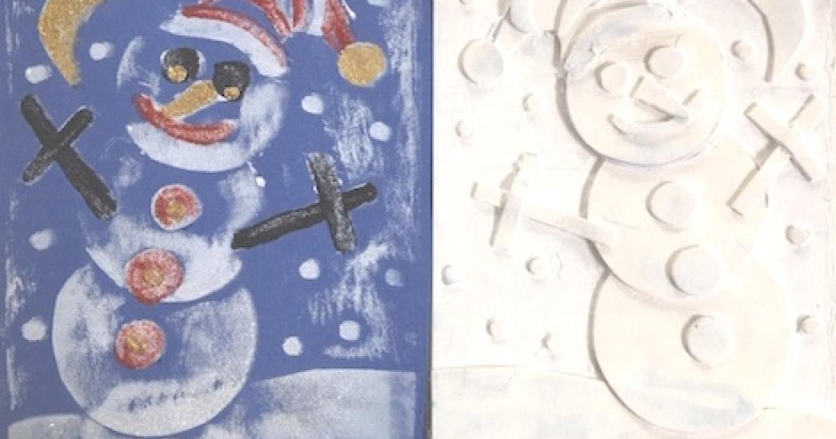 Have a blast creating a snowman print using peel and stick foam shapes, printing making inks, and your feet! Once ink is rolled over the collagraph print plate, participants will place paper over the inked plate and stomp on top of the paper to create a fun print. Glitter details add sparkle to finished prints. Register and pick up a supply kit beginning February 15.