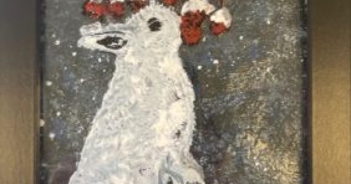 Create a beautiful painting of a winter rabbit, reaching up to eat some bright red berries. Register beginning February 11.