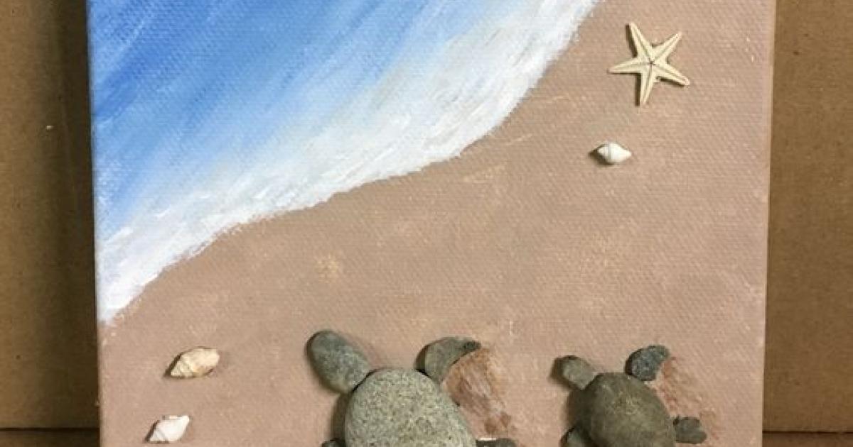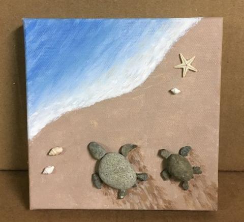 On a canvas create this adorable Sea Turtle art using blue paint, mod podge and sand. Each registrant should bring at least 10 pebbles/rocks in assorted sizes to this class. Registration begins July 1.