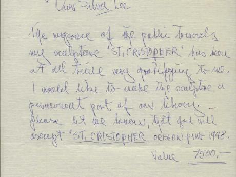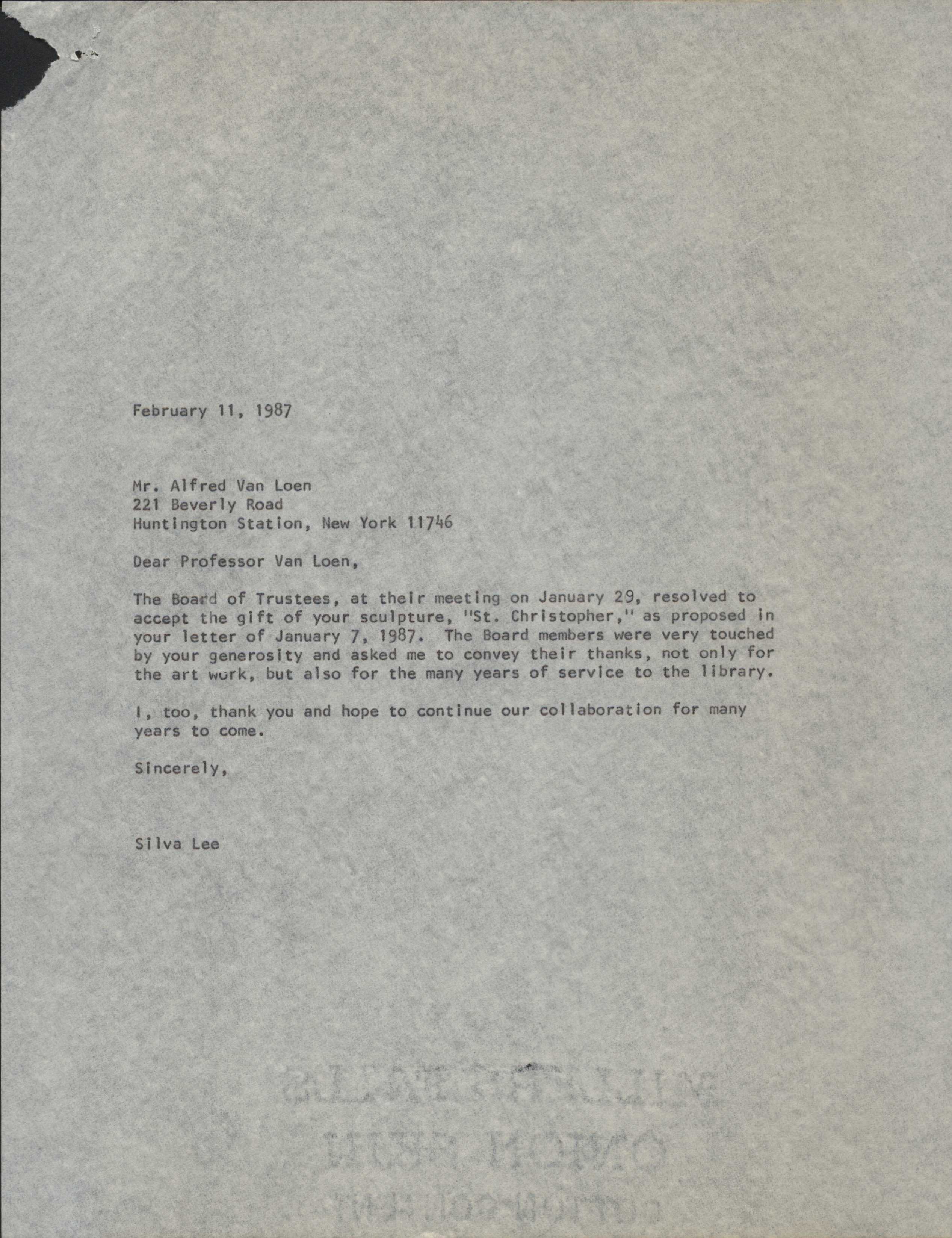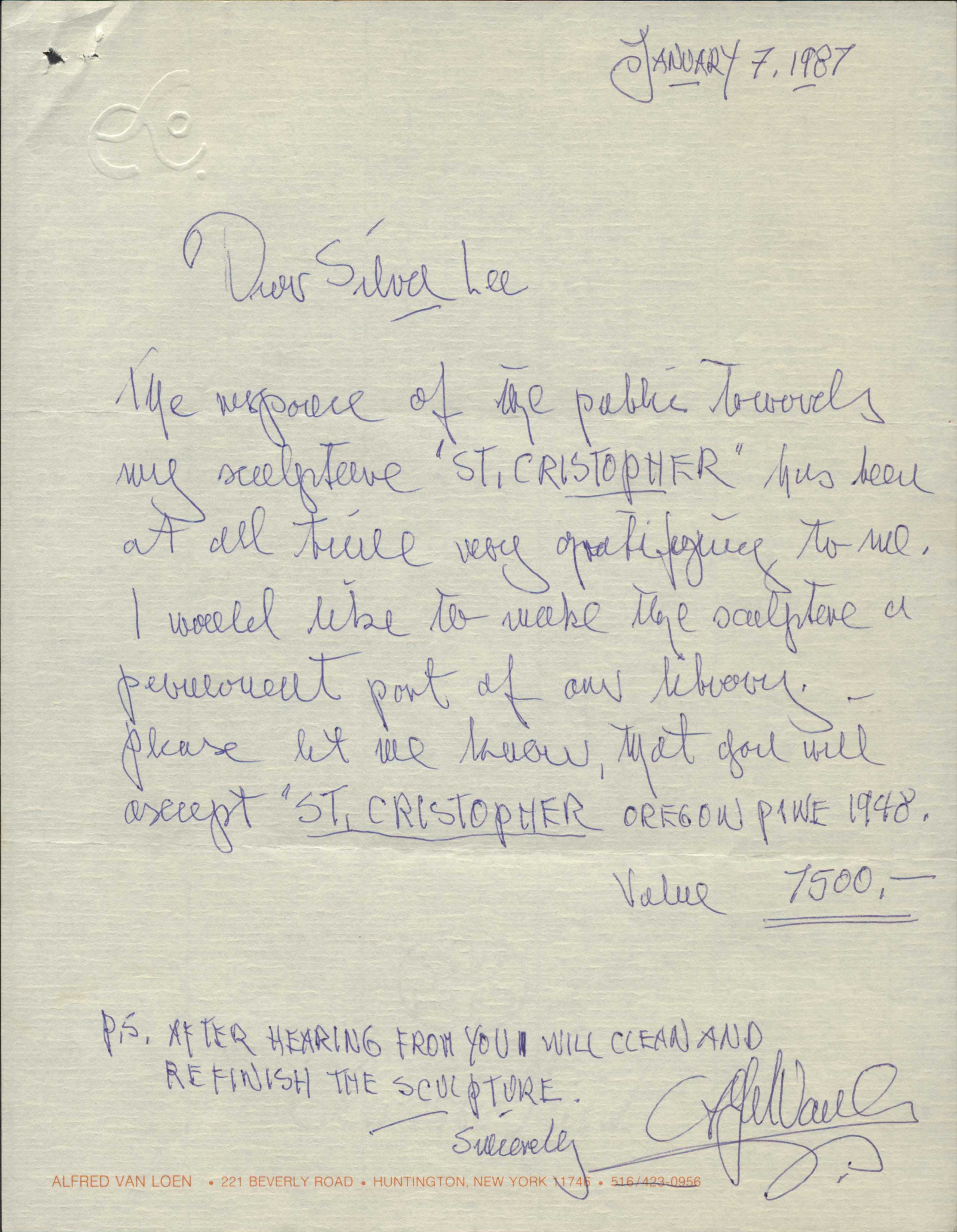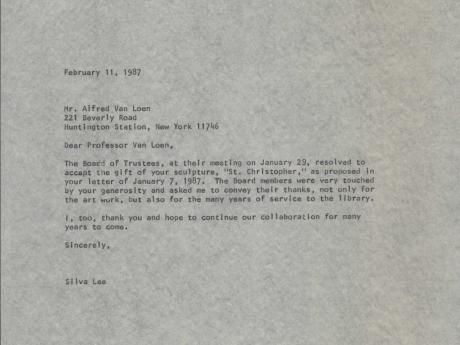 Artist(s) Alfred Van Loen Year Created 1948 Type(s): Permanent Donor(s) Alfred Van Loen Oregon Pine, 1948. Donated to the library by Alfred Van Loen. Located in the Adult Library. Additional Items Van Loen Donation Letter Handwritten letter from Alfred Van Loen donating his St. Cristopher sculpture to the library. × Thank You Note Note from library Director Silva Lee thanking Alfred Van Loen for the St. Cristopher sculpture donation. × St. Cristopher Undated photo of the St. Cristopher sculpture. ×