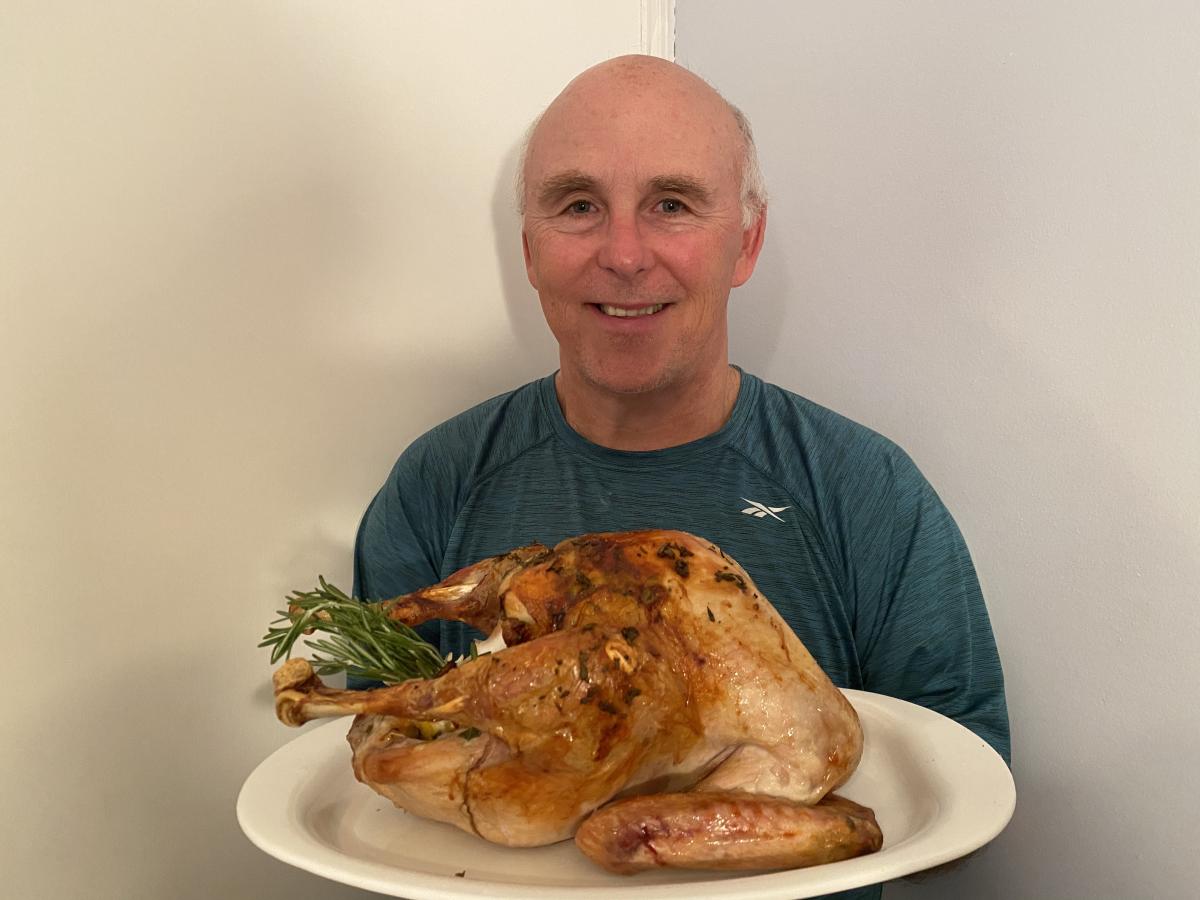 Photo of Chef Rob holding a platter with a roast turkey.