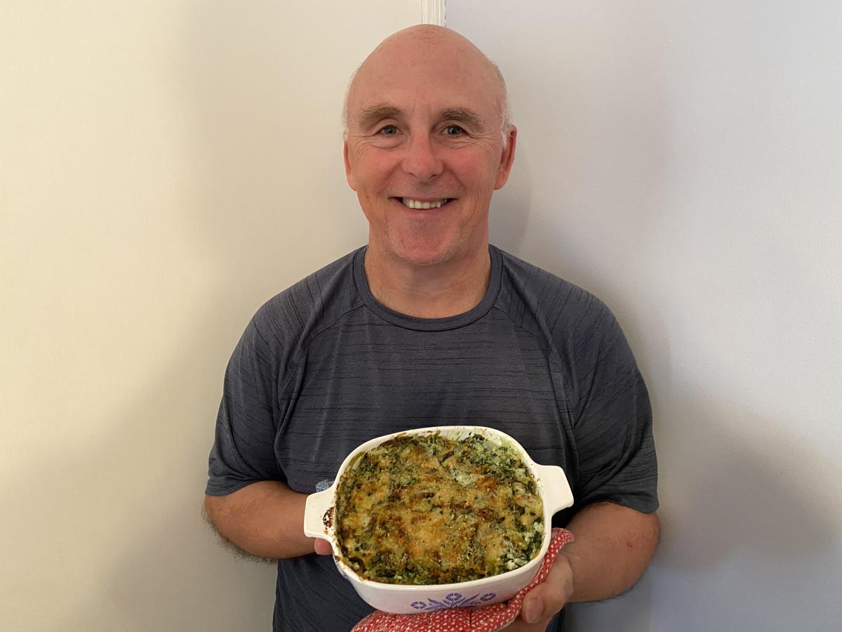 Photo of Chef Rob with a dish of Panko, Parmesan, Spinach & Artichoke Casserole.