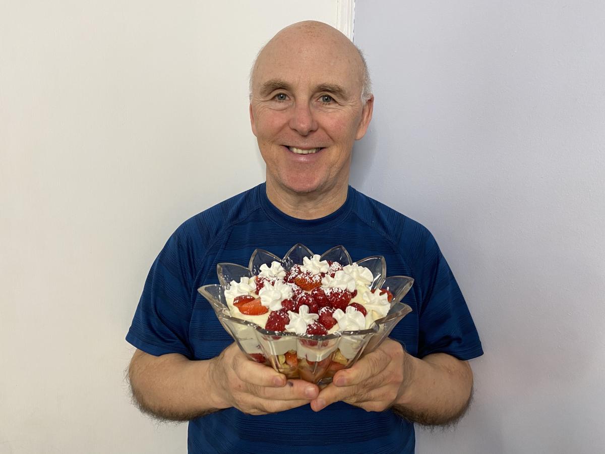 Chef Rob holding a dish containing a Berry Tiramisu Trifle.