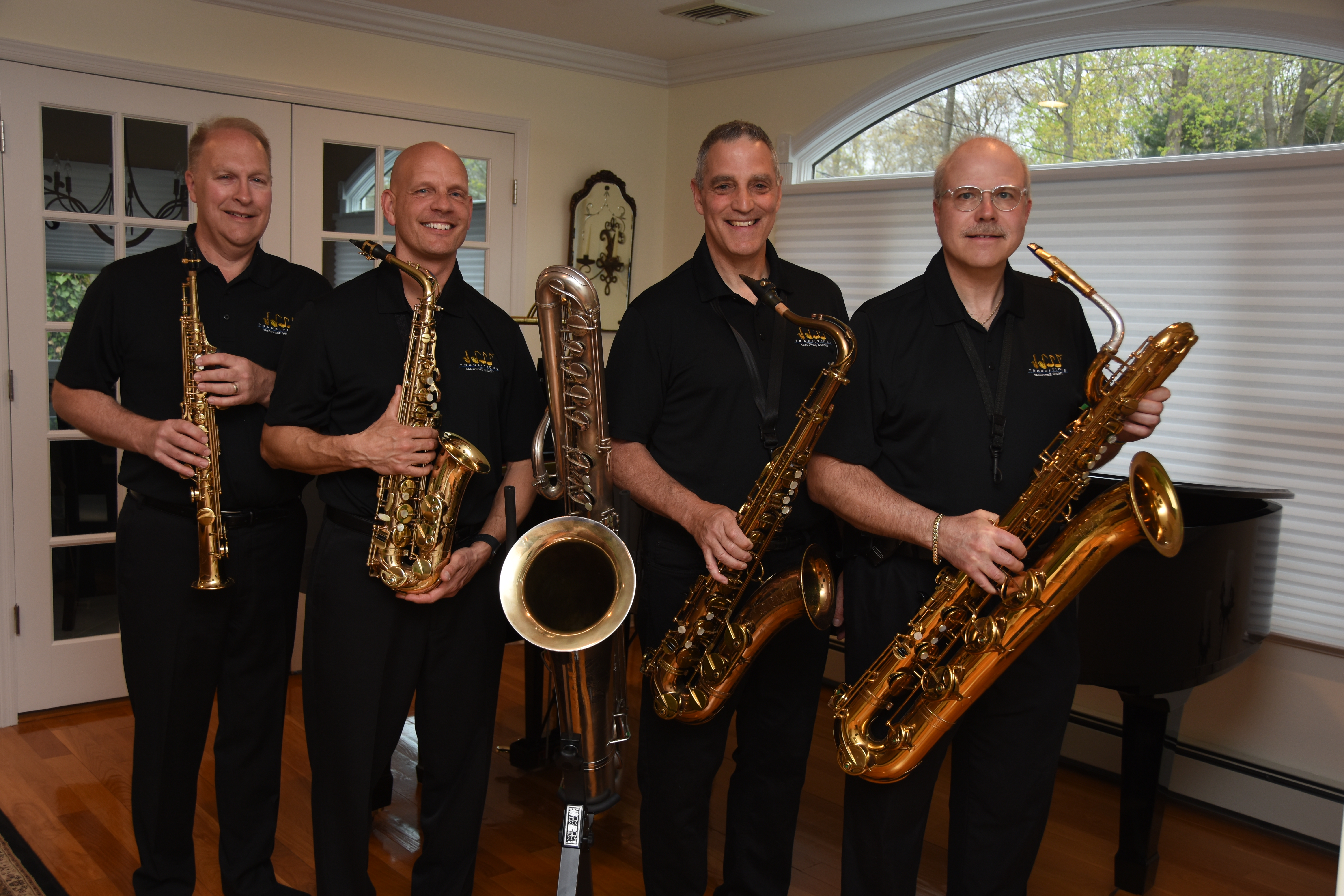 Color photo of four members of the Transitions Saxophone Quartet holding their instruments.