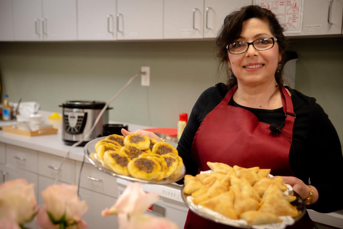 A photo of Chef Naela smiling and holding plates of Mediterranean food..